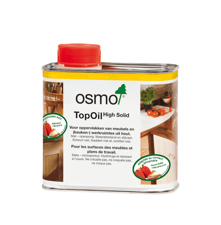 Voor eiken tafelbladen adviseren wij een olie-afwerking. Een veelgebruikte en betrouwbare keuze is OSMO TopOil, speciaal ontwikkeld voor meubel- en tafelbladen.