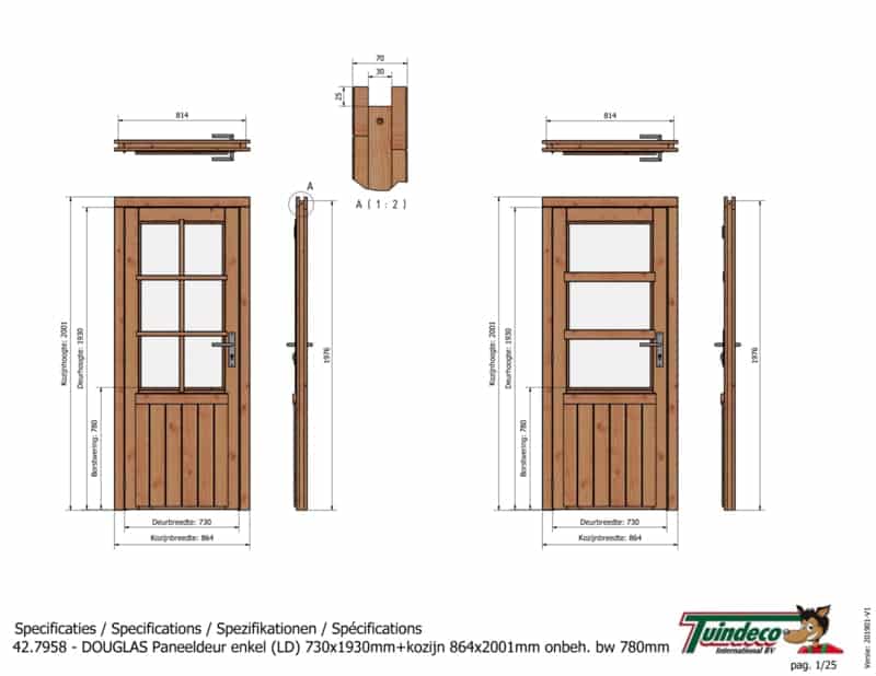 Een douglas kozijn met deur is een bouwpakket van douglas kozijnhout en een douglas deur met hang en sluitwerk. De deur is hierbij voorzien van enkel glas met voorzetroedes. Deze set word veelal gebruikt in overkappingen, bergingen en schuren.