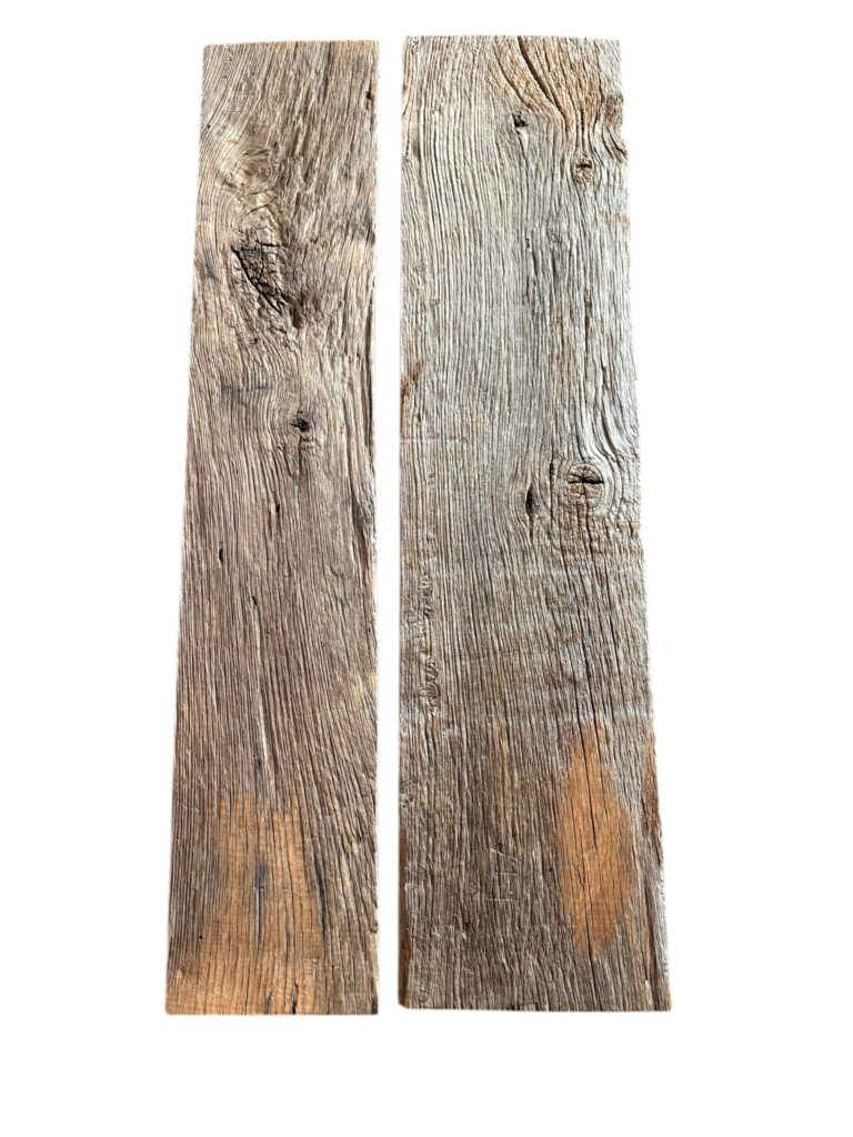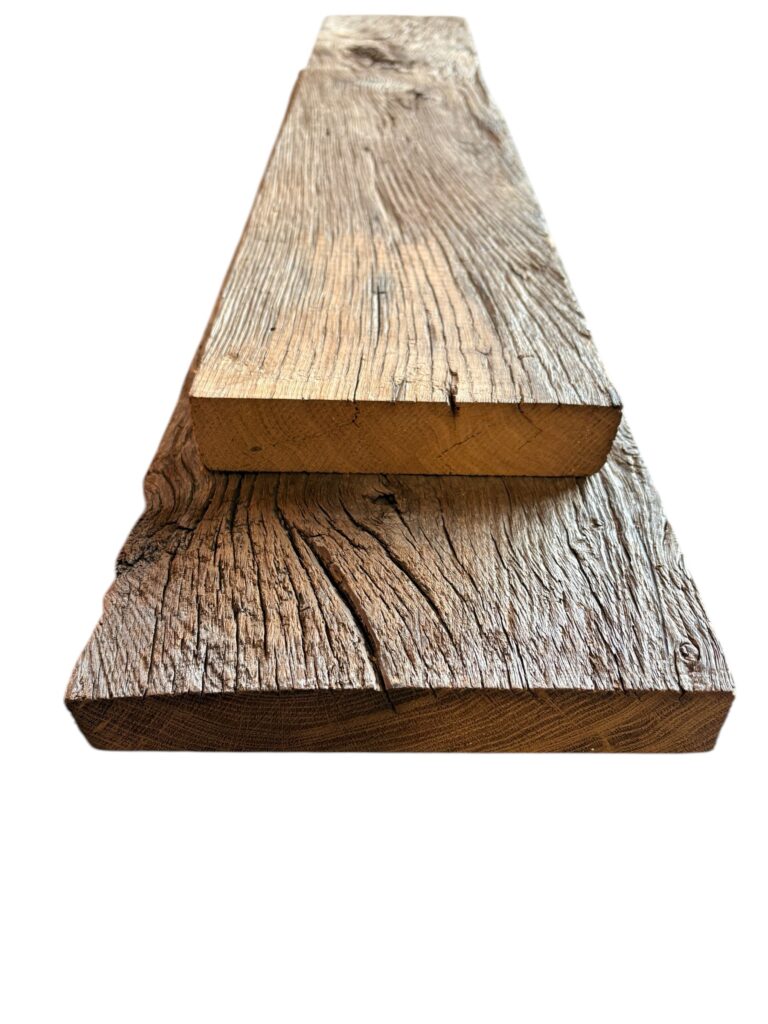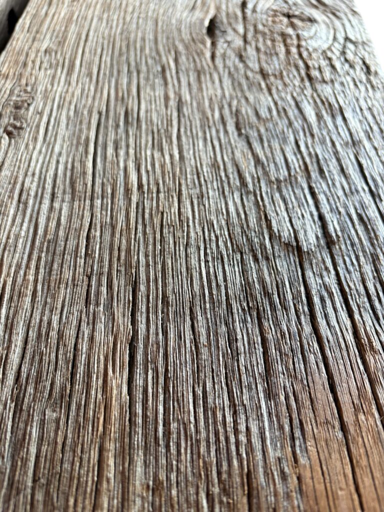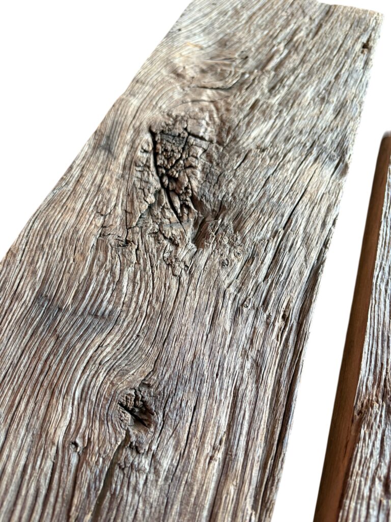 Wat oud eiken zo bijzonder maakt, is de onregelmatige structuur en verweerde look. Door jarenlang gebruik zijn scheuren, noesten, verkleuringen en gebruikssporen ontstaan. Dit geeft iedere plank een eigen karakter en maakt elk stuk volledig uniek.